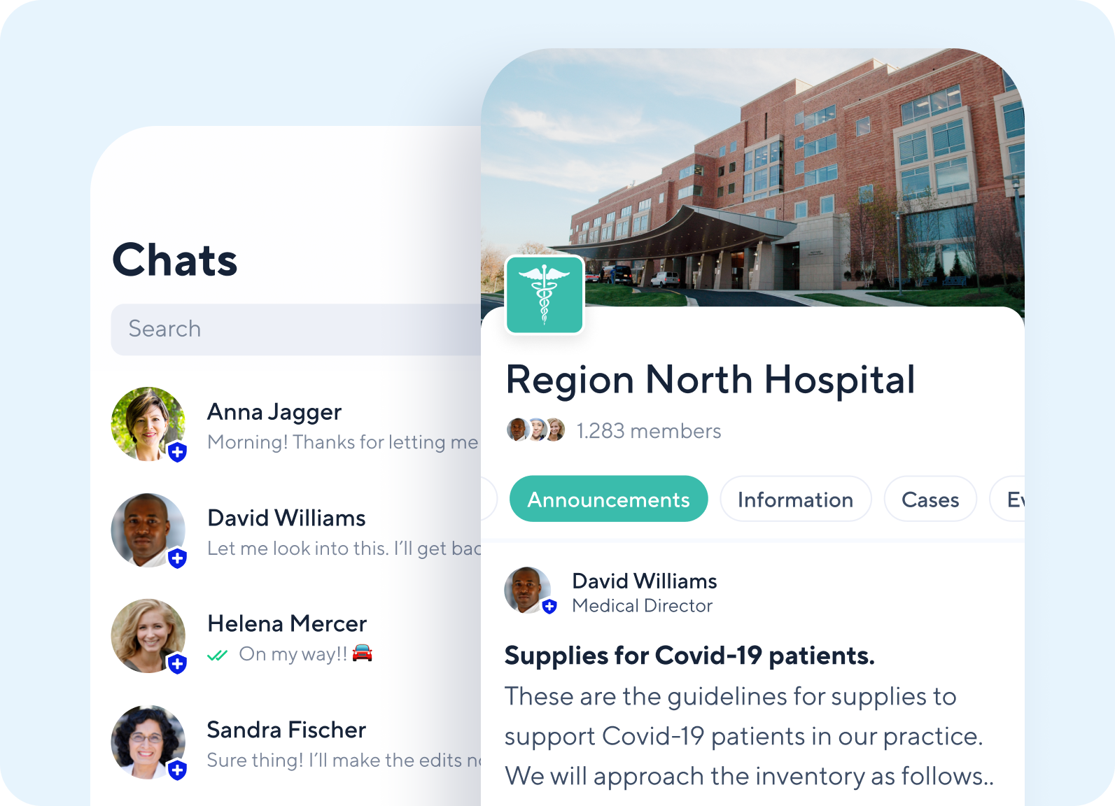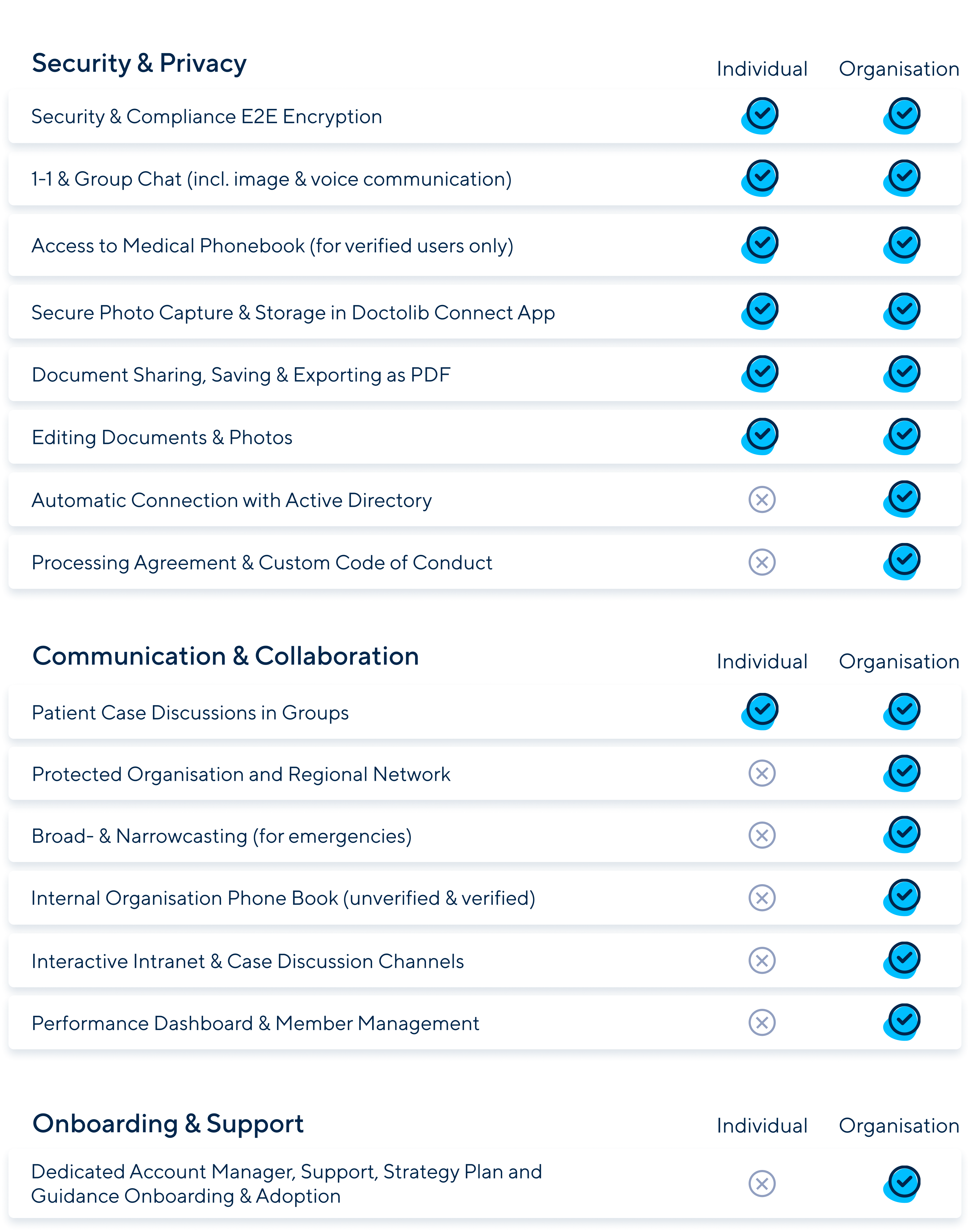Connect for Organisations offers you the possibility of working in a network on Doctolib Connect: The secure communication app for healthcare professionals. Doctolib Connect is guaranteed to meet the highest healthcare compliance standards.