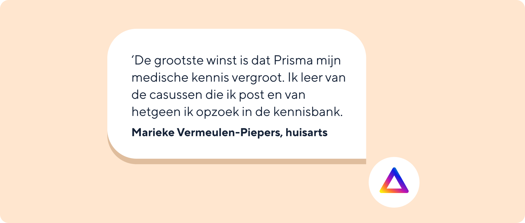Andere typen casussen waarvoor ik Prisma graag gebruik, zijn de niet alledaagse dingen die je tegenkomt in de praktijk. Als huisarts weet je weinig van veel, maar de specialist weet veel van weinig. Daarom is het heel fijn om de zeldzame gevallen die je ziet en waarvan je zelf even niet weet wat je ermee aan moet aan een groepje specialisten voor te kunnen leggen.’