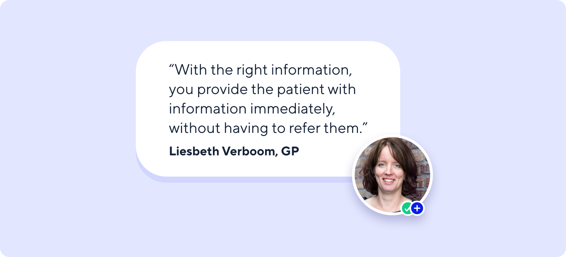 If I am at a loss as to what to do, I first look in the knowledge base to see if something has already been described about a not too complicated case,’ Liesbeth explains. It’s nice to be able to look things up when you think: what was it again? Or if you are curious about the current guideline for a certain disorder. With the right information, you provide the patient with information immediately, without having to refer them.’