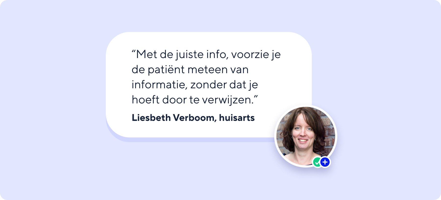 ‘Kom ik zelf ergens niet uit, dan kijk ik bij een niet al te ingewikkelde casus eerst in de kennisbank of er al iets over beschreven is’, legt Liesbeth uit. ‘Het is fijn om dingen op te kunnen zoeken als je denkt: hoe zat het ook alweer. Of als je benieuwd bent naar de tegenwoordige richtlijn bij een bepaalde aandoening. Met de juiste info, voorzie je de patiënt meteen van informatie, zonder dat je hoeft door te verwijzen.’